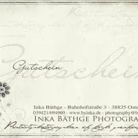 Inka Bäthge Photgraphy | GutscheinFalls Ihr einen Gutschein für ein Shooting bei mir verschenken wollt, ist das selbstverständlich auch möglich. Aus verschiedenen liebevoll gestalteten Motiven sucht Ihr Euch Euren Favoriten aus und legt den Wert fest. Der Gutschein liegt dann zur Abholdung bei mir im Studio oder wird an die Adresse Eurer Wahl versandt.